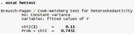 Uji regresi linear harus mempunyai sifat homoskedastisitas. Untuk uji heteroskedastisitas banyak metode, tetapi dalam hal ini kita menggunakan metode Breusch-Pagan. Dikatakan tidak terjadi gejala heteroskedastisitas apabila nilai P value yang ditunjukkan dengan “Prob > chi2” nilainya > 0,05.