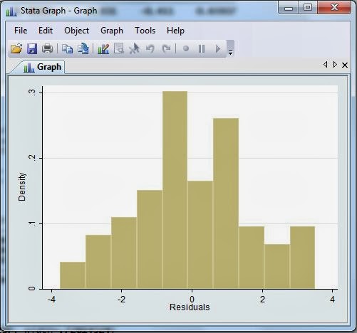 Interprestasi Asumsi Klasik Regresi Linear dengan STATA Lihat nilai Prob>chi2 pada skewness/kurtosis test for Normality. Apabila nilainya lebih dari 0,05 maka residual berdistribusi normal. Di atas nilainya 0,7028 maka residual berdistribusi normal. Sehingga berdasarkan uji Skewness Kurtosis, residual dinyatakan berdistribusi normal.