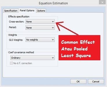 Apabila anda berada pada kondisi pasca hausman test dan menerima H0, maka silahkan lakukan analisis common effect. Caranya adalah pada “Jendela Equation” anda klik tombol Proc -> Specify/Estimate. Kemudian jika muncul “Jendela Estimation Equation” anda pilih “Tab Options” kemudian pada combo box Cross-Section silahkan pilih None. Tampilannya adalah sebagai berikut: